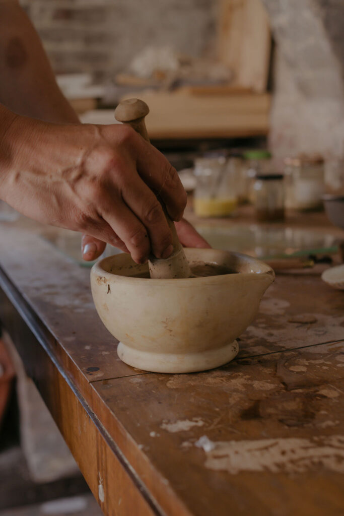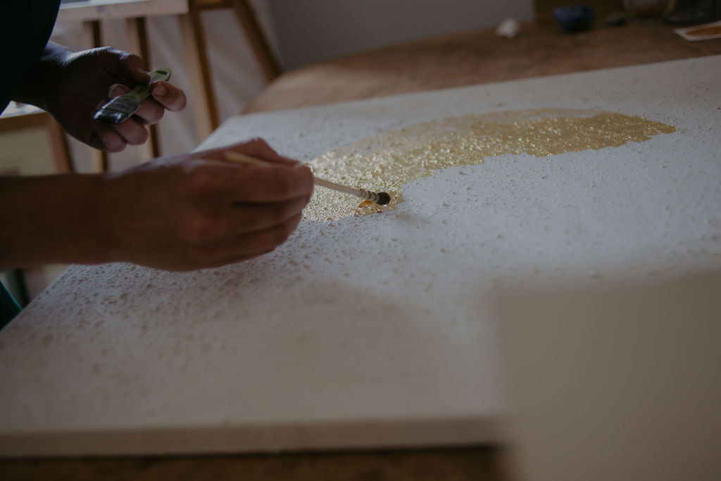 Elisabeth den Boer is a painter who creates radiant golden sun paintings and intricate floral compositions. She uses mostly hand foraged materials and methods passed down through sacred traditions.